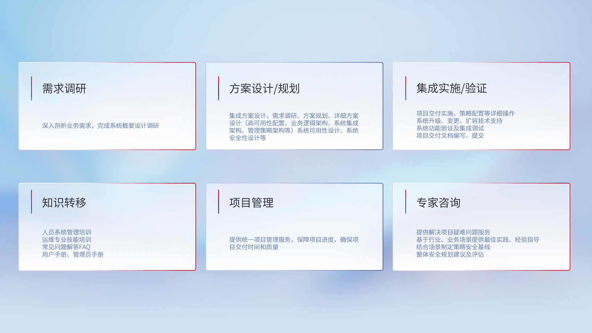针对客户行业特性,,,将宏观的安全战略和需求,,,,通过专业的交付服务,,,实现项目落地,,为客户提供标准规范的集成交付服务。。。。